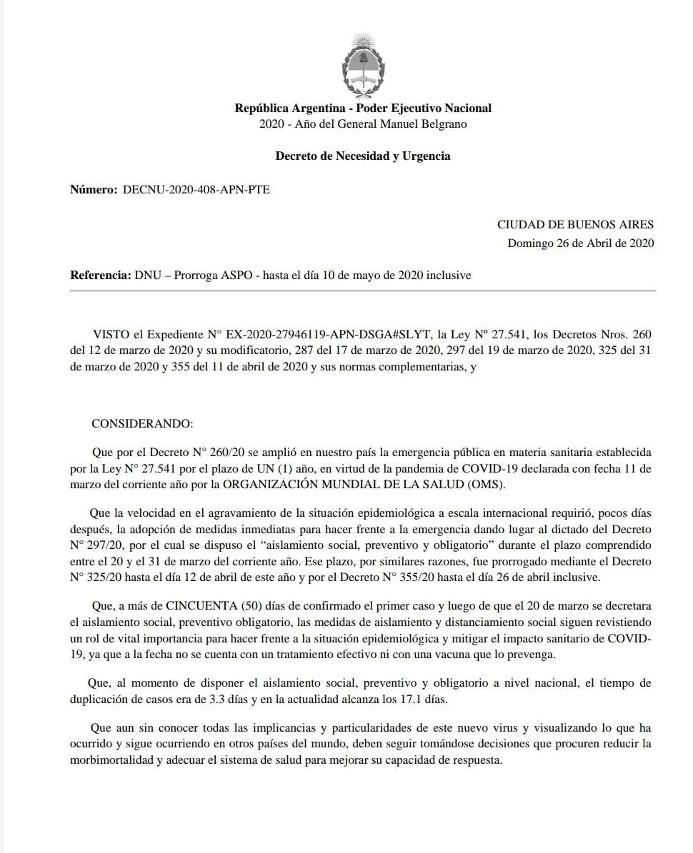 Decreto 408/20 PEN: Prórroga del Aislamiento Social Preventivo y Obligatorio, hasta el 10 de Mayo/20
